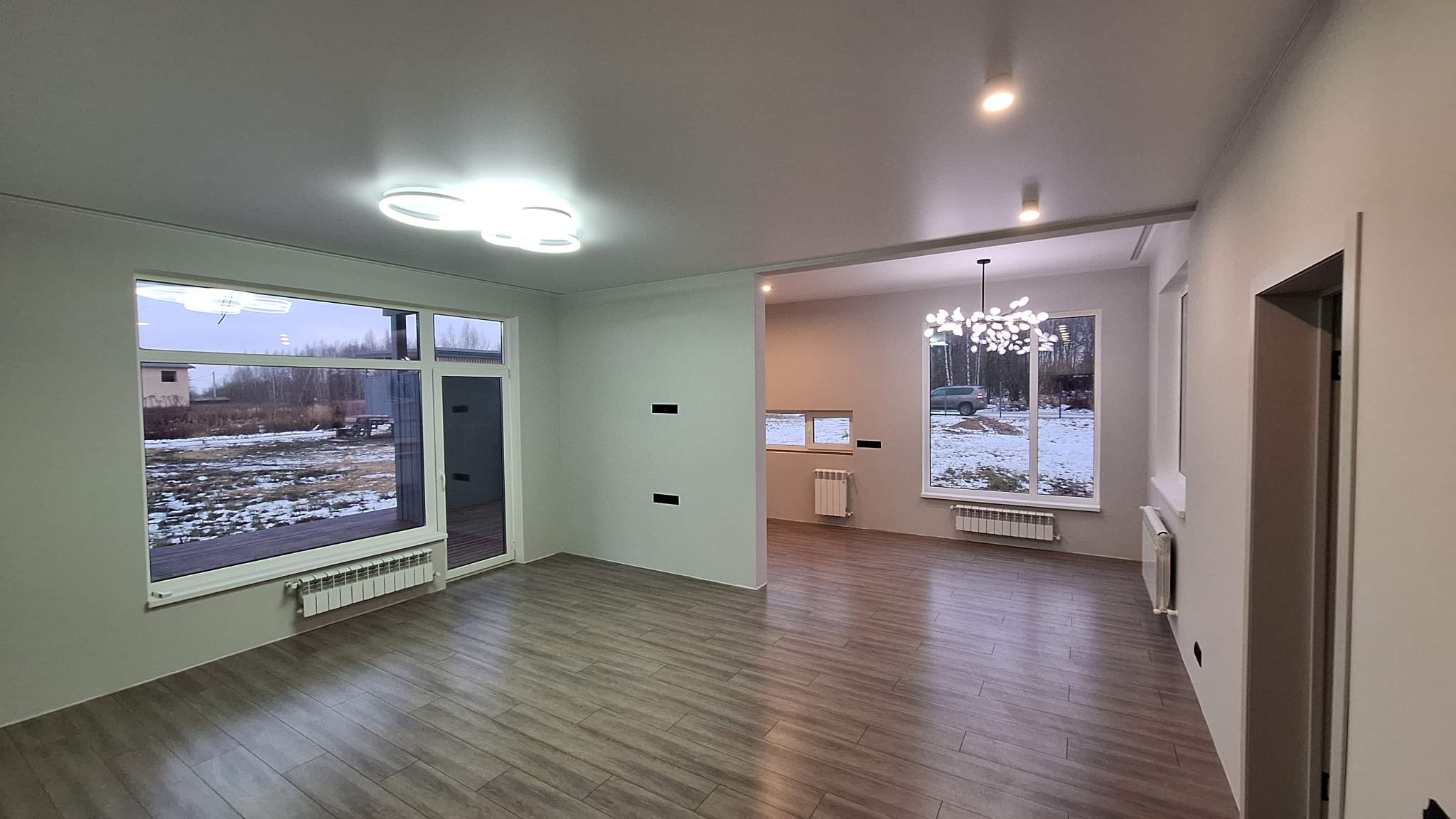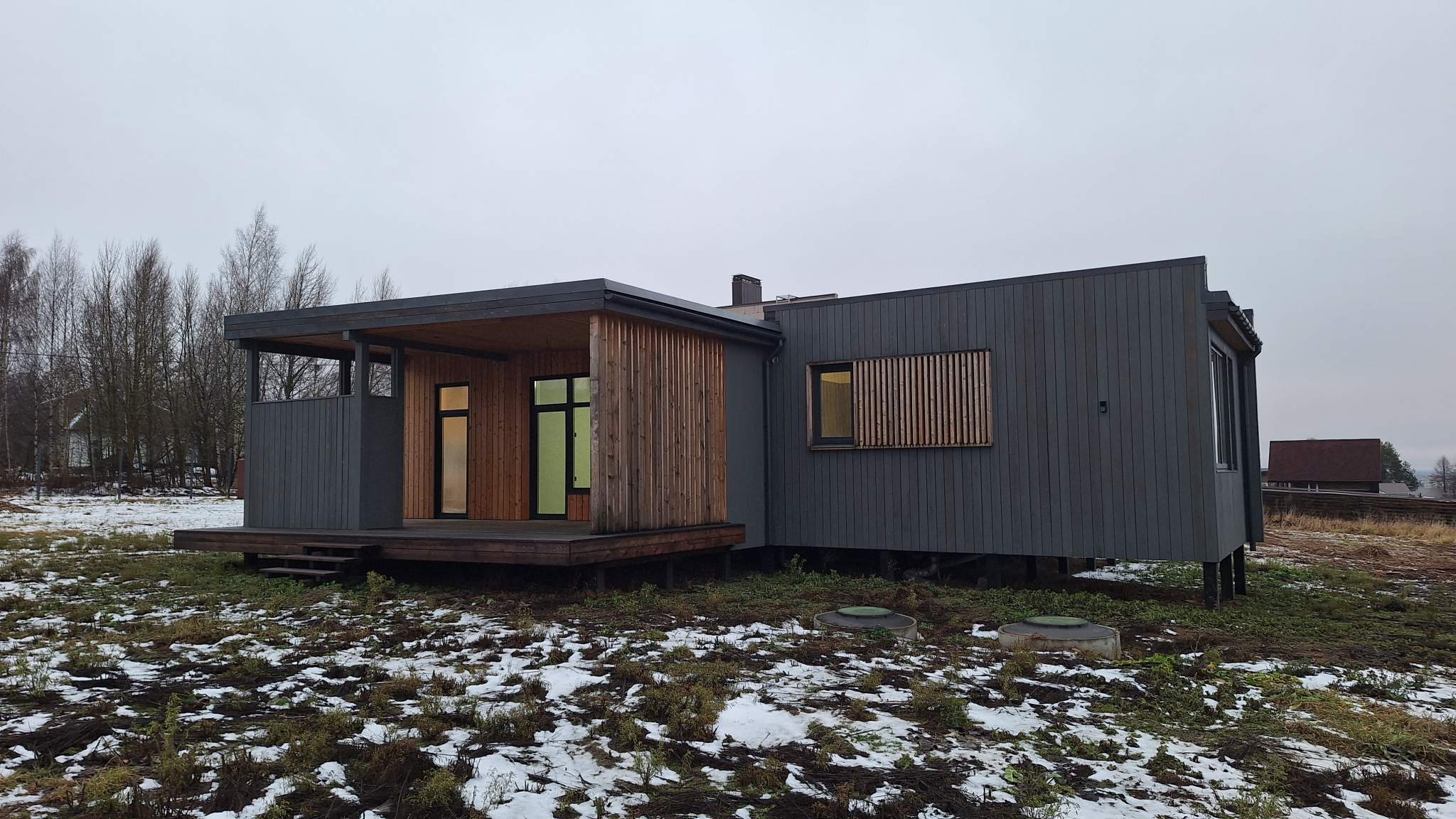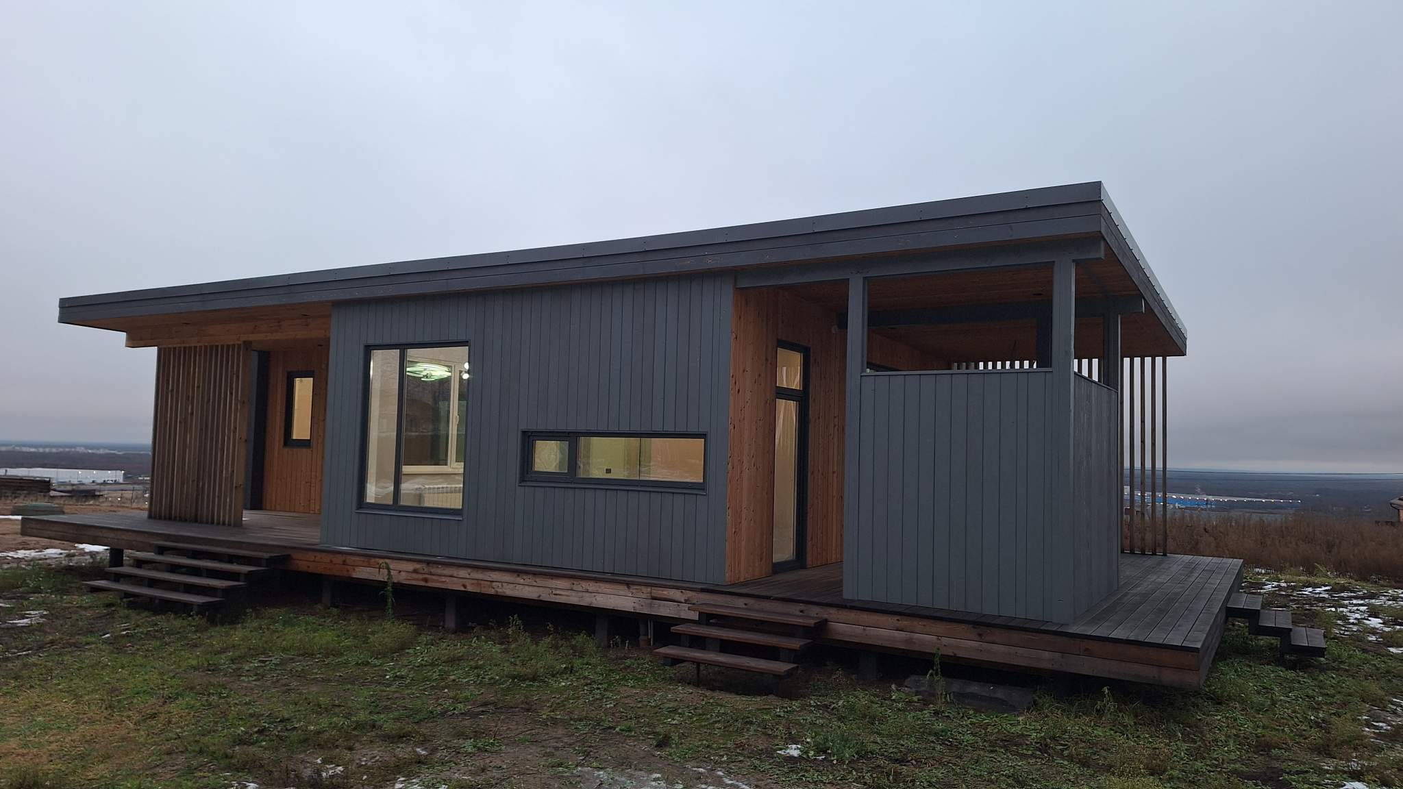 Дом 100 кв.м., построен по финской технологии, с двумя террасами + 50 кв.м. к площади дома, панорамным остеклением, удобная планировка: 3 спальни, просторная гостиная с кухонной зоной, высокие потолки 3 м – много света и воздуха.